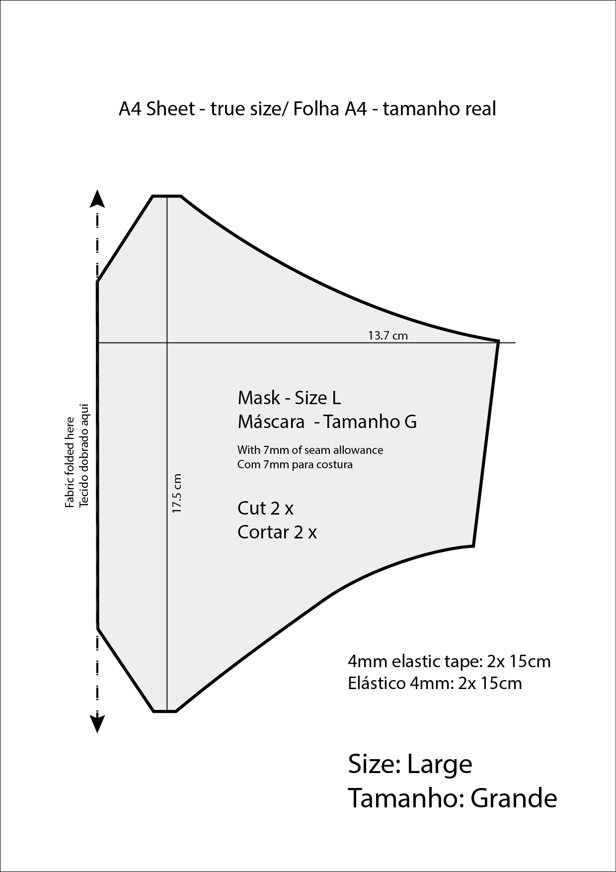 Imprima o molde desejado em uma folha A4. Corte o tecido dobrado duas vezes. Costure as pinças. Prenda as tiras elásticas e costure quase toda a máscara (deixe cerca de 10cm abertos para poder virar a máscara e deixar o lado correto para fora). Finalmente, costure toda a volta da máscara conforme mostrado em nosso vídeo no YouTube, clique aqui.